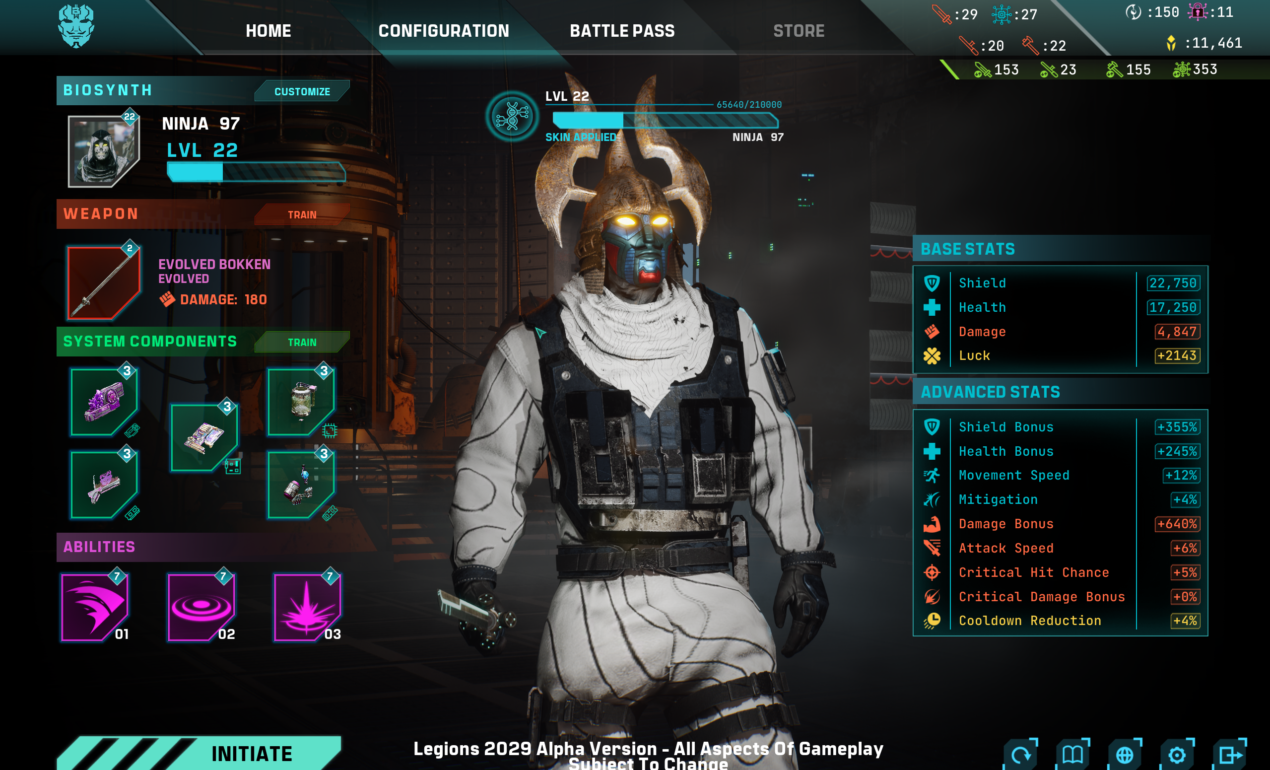 **Choosing Your Gear**: By clicking on the Weapon or System Component icons in the Current Configuration menu, you can open the “Biosynth Settings” menu to choose your gear, train your proficiencies, and select your abilities.